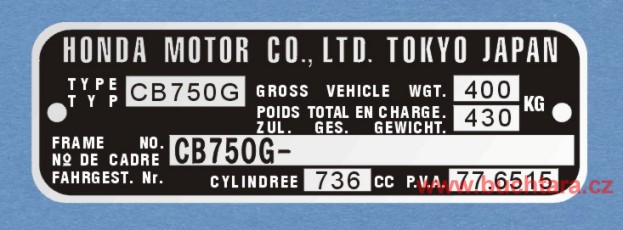 Výrobní štítek Honda CB 750G