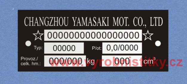 Výrobní štítek CHANGZHOU YAMASAKI - hmotnost pro dotisk500 Kč/ ks