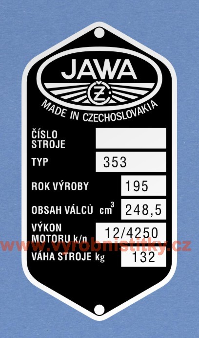 Výrobní štítek JAWA 250 Kývačka váha 132 ČÍSLO STROJE220 Kč/ ks