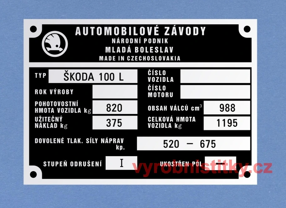 Výrobní štítek Škoda 100 L hmota 820 nápr 520-675
