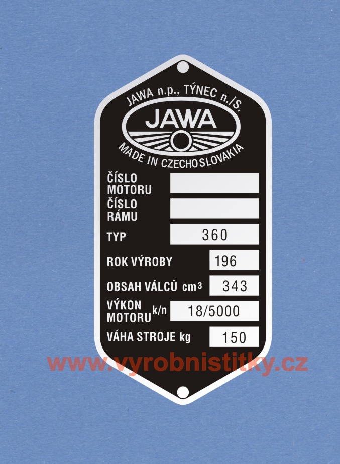Výrobní štítek JAWA 350 360 rv 196 váha 150,obs. 343 ccm220 Kč/ ks