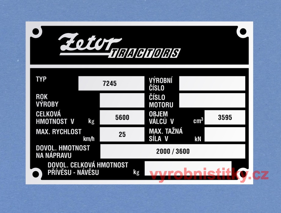 Výrobní štítek Zetor TRACTORS 7245 - DOV.HM. 2000/3600890 Kč/ ks