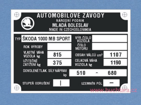Výrobní štítek Škoda 1000MB SPORT