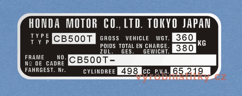 Výrobní štítek HONDA CB500T880 Kč/ ks