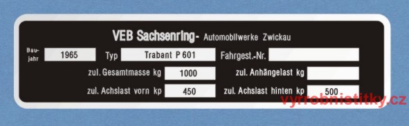 Výrobní štítek Trabant P601 německý text