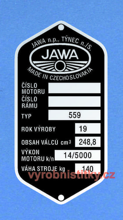 Výrobní štítek JAWA-ČZ 559 Týnec, váha 140, r.19