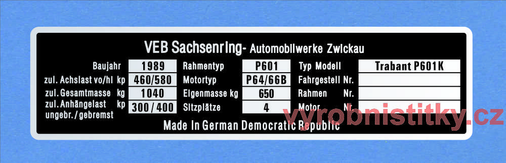 Výrobní štítek Trabant P601K německý, Bau 1989