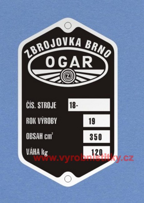 Výrobní štítek OGAR Zbrojovka Brno, 18-, obsah 350220 Kč/ ks