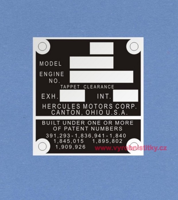 Výrobní štítek HERCULES MOTORS U.S.A.
