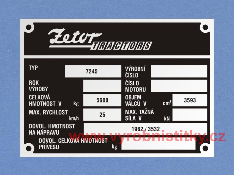 Výrobní štítek Zetor TRACTORS 7245 - DOV.HM. 1962/3532
