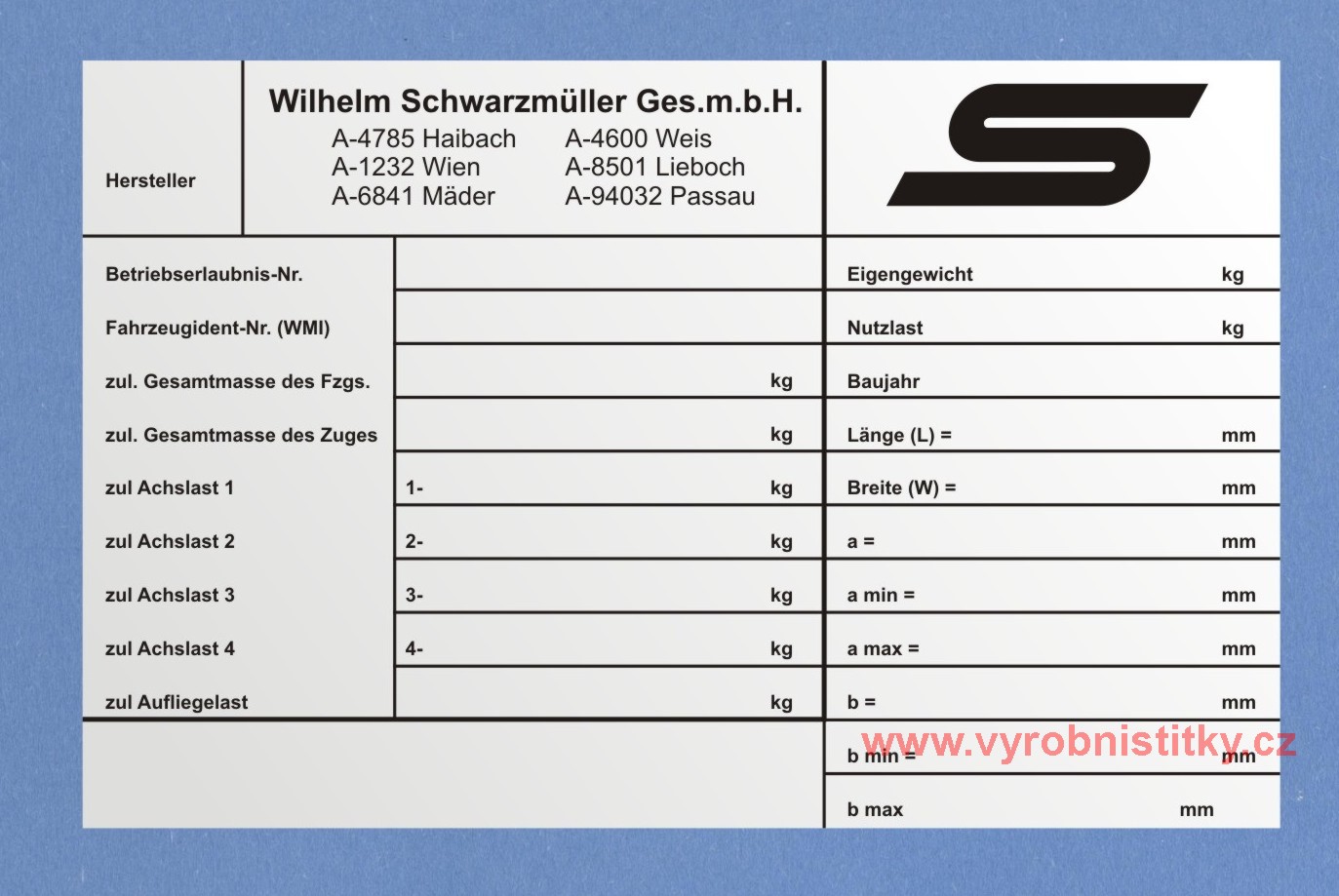 Výrobní štítek Schwarzmüller 195 x 125 mm1 310 Kč/ ks