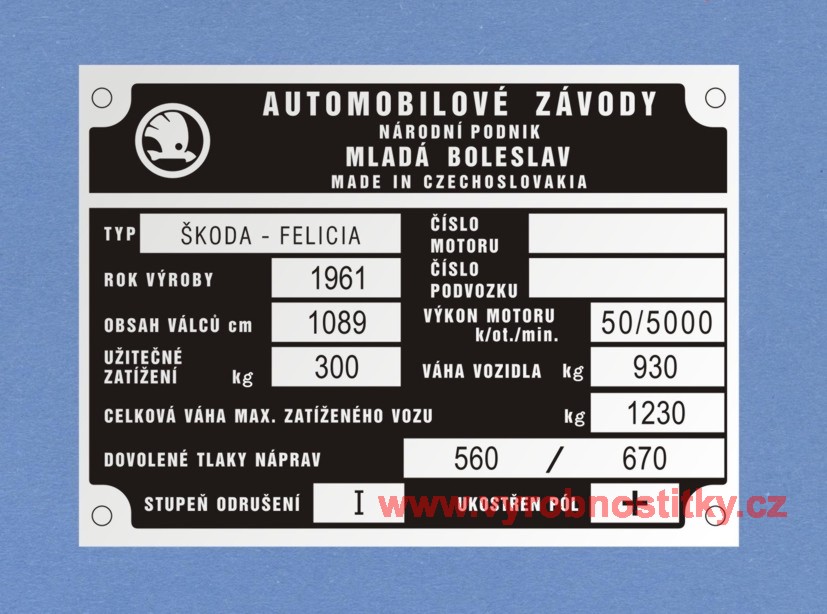 Výrobní štítek Škoda Felicia rv 1961 váha voz. 930880 Kč/ ks