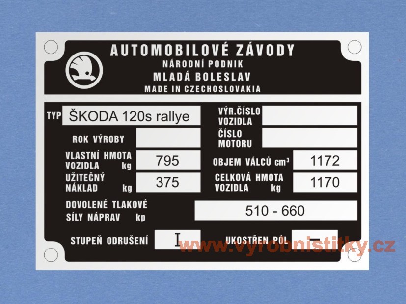 Výrobní štítek Škoda 120s rallye hmota 795 kg