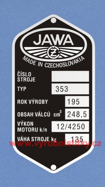 Výrobní štítek JAWA 250 Kývačka ot. 4250-váha 135 ČÍSLO STROJE220 Kč/ ks