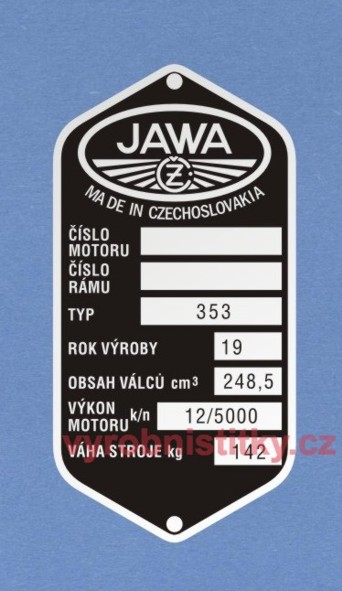 Výrobní štítek JAWA ČZ-250 typ 353 výk 12/5000220 Kč/ ks