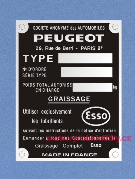 Výrobní štítek SOCIETE ANONYME des AUTOMOBILES PEUGEOT Esso